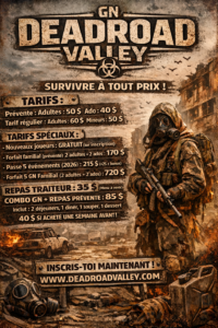 DeadRoad Valley est un événement s’adressant aux personnes de 14 ans et plus inspiré par l’univers chaotique post-apocalyptique, avec une dose de science-fiction, à la Last of Us et 28 jours plus tard.